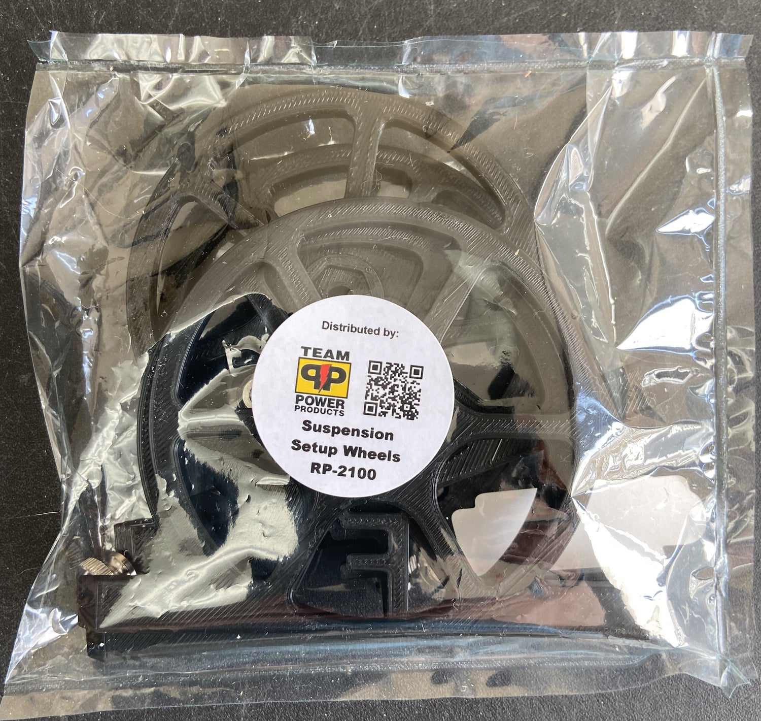 Setup your race car more easily and accurately than before. Find a flat, level surface, remove tires, install the setup wheels, and make your measurements! Accurately check and adjust camber, toe in (out), and ride height at the same time. Designed by Ron (Rocket Products) Free and tested by James Brown. Kit includes four setup wheels and four knurled nuts.